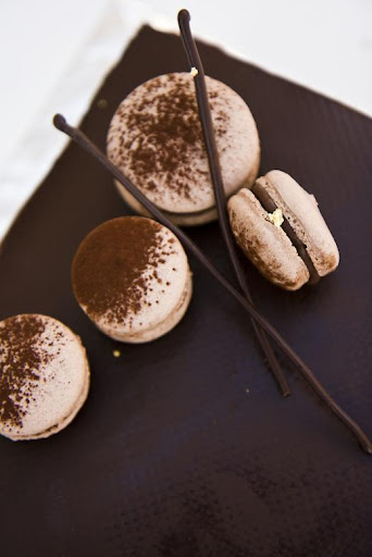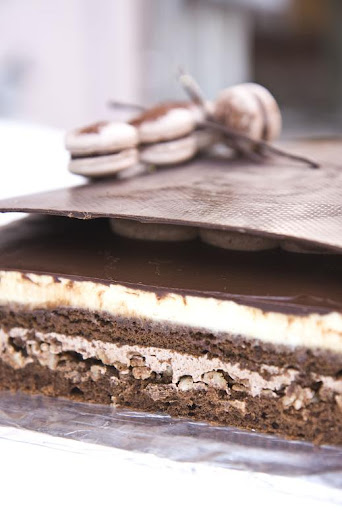 I didn't want to make a chocolate type of cake because I think I made enough lately and craving for something lighter and a bit summery, but I've had a layer of tiramisu cream on top of espresso/rum soaked chocolate cake already assembled in the fridge. So what I did was, I made another layer of chocolate cake, soaked in espresso/rum mixture, dark chocolate whipped cream, rice crispy with hazelnut paste and milk chocolate layer, and a thin plate of just dark chocolate couverture. I made it into a square cake just for a change, and so that I won't have to decorate the side. Luckily, I also had some unfilled macarons in the freezer (which I filled with ganache later on), great time saver for decoration, and the cake was done! I even had time to babysit my baby niece which I don't get to see everyday.