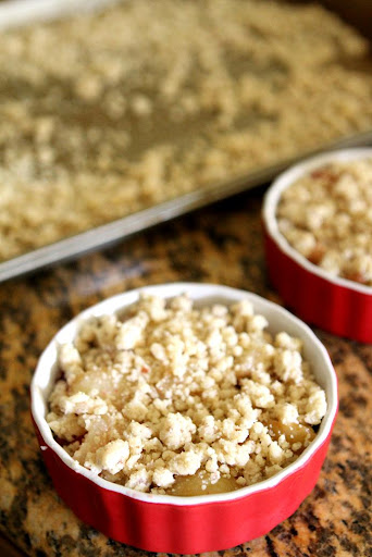 - Bake in a preheated oven at 350 F for about 30 minutes or until it's bubbly and the crumble topping is nicely browned.
