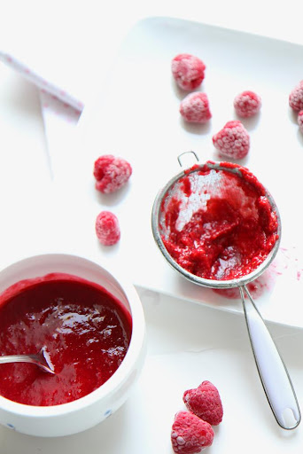 Cook the raspberry and the sugar until boiling. Strain the mixture to get as much liquid as possible