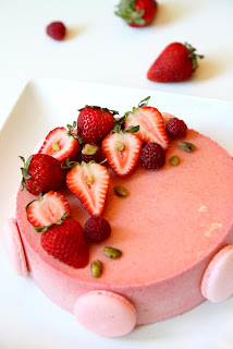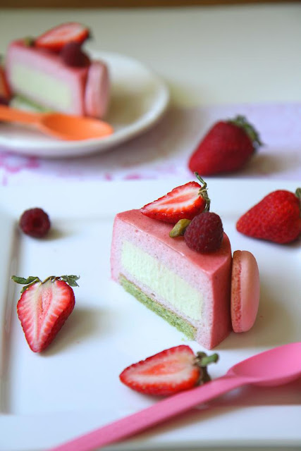 To be honest, I was a little worried about the strawberry mousse as the gelatin amount was still the same, but everything turned out pretty much perfect. I had the strawberry flavor I was looking for and the gelatin was enough to hold the mousse together, it was really soft, the same melt-in-your-mouth texture as the pistachio mousse. I am still dying to try his strawberry mousse recipe though and I am currently looking for a wild strawberry puree available. I had pink macarons ready, so I didn't make it the way Mr. Sugino made it, in a ladyfinger shape. For the glaze, I made it using the same recipe as i always did, which comes from Pierre Herme's recipe.