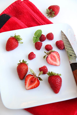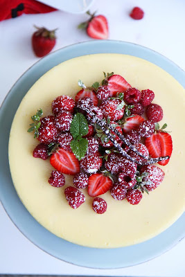 I topped the cheesecake with sweet organic strawberries and raspberries (M loves the combination of cheesecake and strawberry). The inside of the cheesecake is still a bit soft, but not runny after being refrigerated for 24hrs. But it seemed to be perfect after 2 days of refrigeration though, it was creamy and soft.
