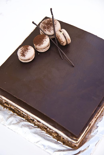 But at least I got this picture here. I had some leftover cream and there's no way that it was going to waste. Worst case, I probably going to freeze it, but fortunately, I had some chocolate sponge cake that I then drenched it in the coffee-rum mixture and I had been dying to try one of my newest baking tool collections :D. I used what's called cake transfer sheet. It is basically a textured mold made from clear plastic, about 1.5" high. I did have some difficulties unmolding it after taking it out from the freezer (I have to freeze it before unmolding), but it works great afterall. I used the leftover chocolate squares from the big cake. I used my arabesques chocolate textured-sheet for this one. I'm starting to really like putting gold dragees on top of tiramisu. I think it makes the cake looks elegant :D, but it's just me though :)
