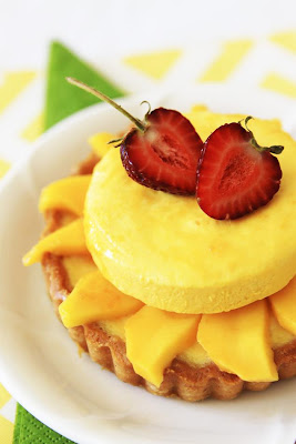 This time, everything seems like it was meant to be for this tart. You probably guessed it right that I have just two 4" baked tart shell from making key lime tartelettes (not featured in this blog), one ripe small mango, two 3" of frozen mango mousse. I did have to make the custard filling for the tart which was a breeze to make, it was just a simple custard made with whole egg, a little cream, and sugar, baked inside the tart shell. Then, I put slices of mango on top of the cooled custard, placed the frozen mango mousse on top, put a strawberry for decoration and color and voila! you got one of the tastiest and simplest mango tart ever! A pile of raspberry, mint leaf, and white choc decor would probably look great on these, but strawberry did the justice just fine.